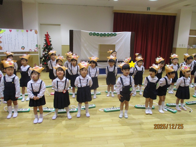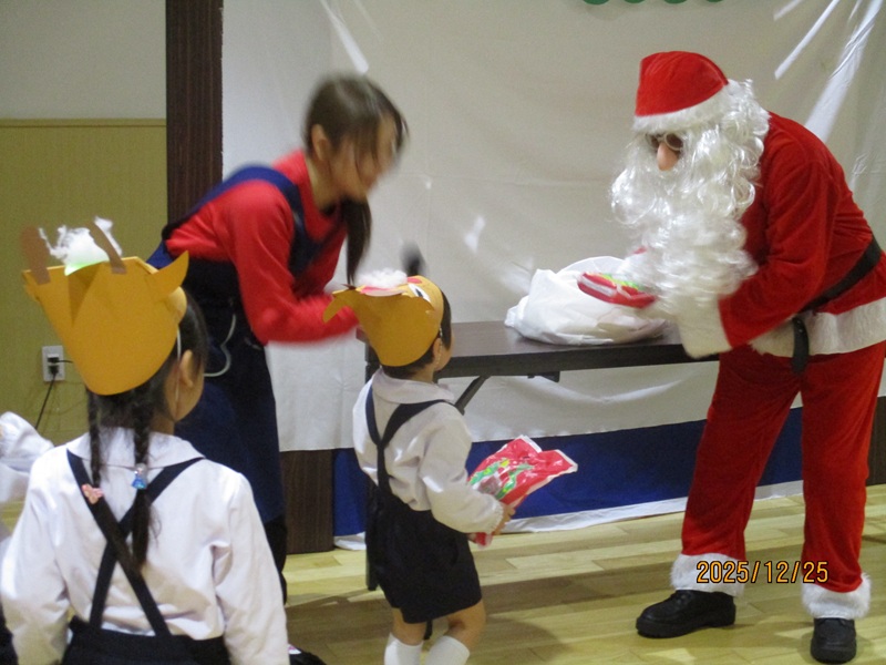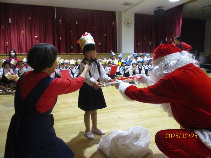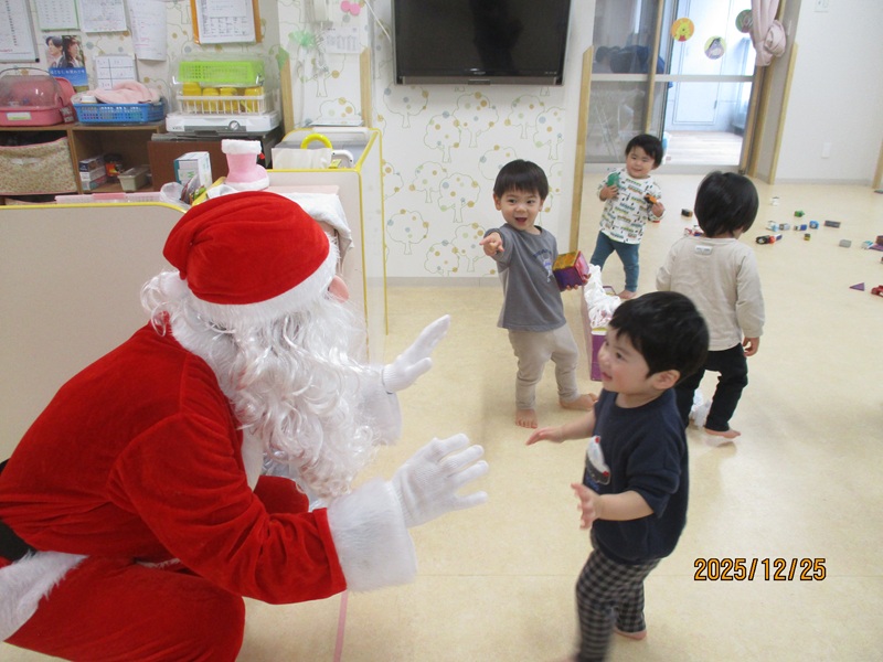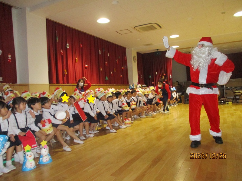 本日の午前中に2.3歳児のクリスマス会が行われました。手作りの帽子をかぶり、2歳児の子どもたちは、『ゆきだるまのチャチャチャ』を歌とダンスでかわいく披露してくれました。3歳児の子どもたちは、頑張って練習をしているピアニカ『かっこう』と歌『世界中の子どもが』を元気よく歌ってくれました。保育士の出し物のマジックでは「ちちんぷいぷいの~ぷい」と子どもたちが大きな声で魔法をかけると不思議なことが!!驚きと楽しさで大盛り上がりでした。クイズにも頑張って答えていました。最後にサンタさんが来てくれて嬉しそう子どもたち!プレゼントをもらいみんなでお礼を言いました。 お昼にもも・あんず組のお部屋にもサンタさんが来てくれました。ビックリして泣いてしまう子もいましたが、ハイタッチをして「バイバイ」と見送っていましたよ。