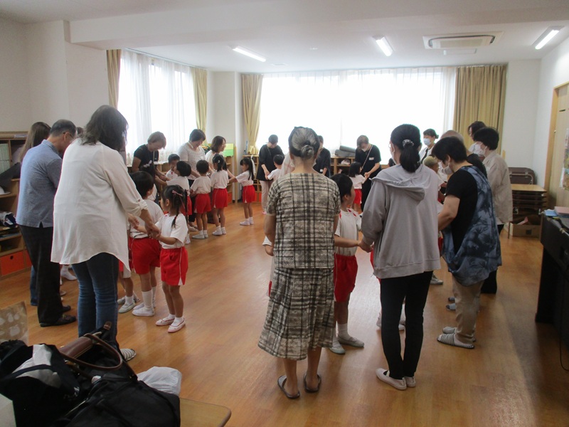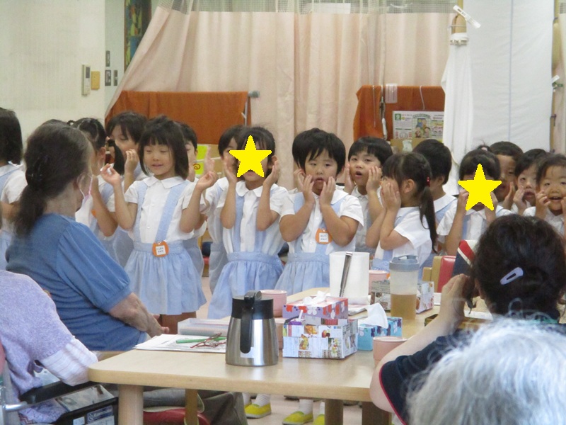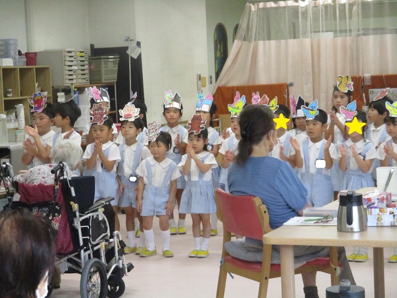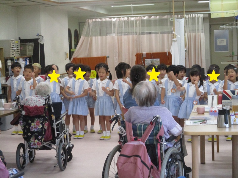 本日、年長組の子どもたちが、老人ホーム(サンローズオオサカ)を訪問しました。りんご組は手遊びと『東京ブギウギ』『見上げてごらん夜の星を』の歌をうたいました。ぶどう組は『幸せなら手をたたこう』『さんぽ』『山の音楽家』を歌って踊りました。おじいちゃん、おばあちゃんはとても喜んで下さり、一緒に歌ったり、振りや手拍子で参加されていました。子どもたちも「かわいいね」「上手やったよ」と拍手をもらい嬉しそうでした。