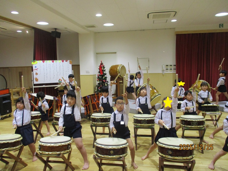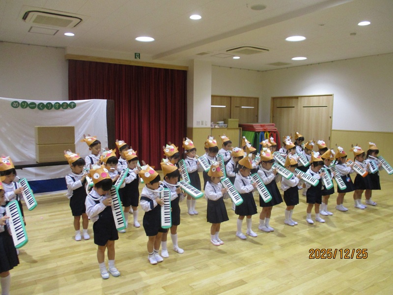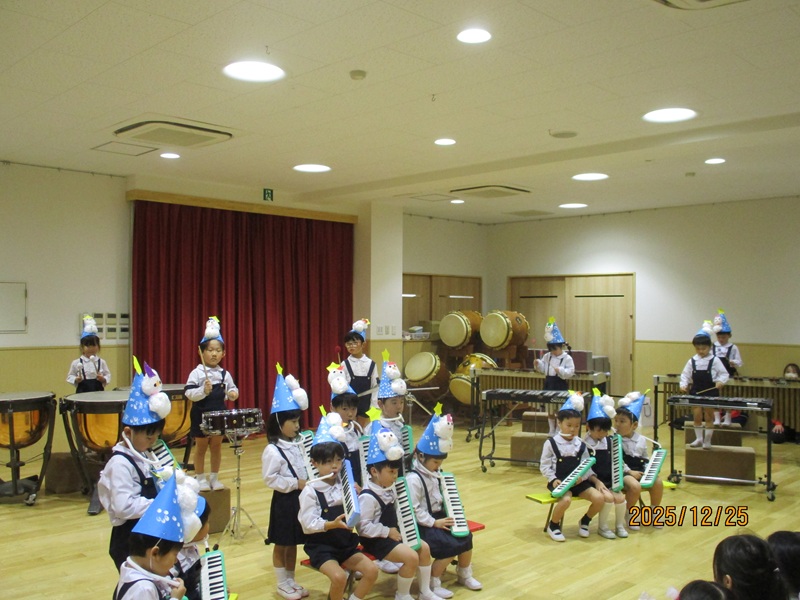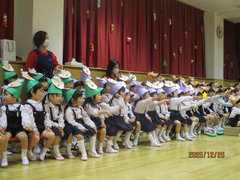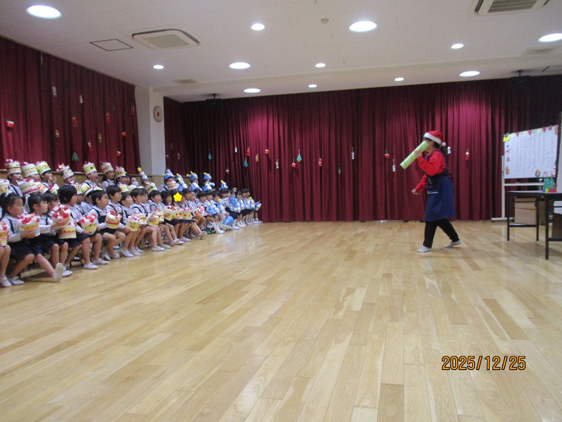 本日、午後より4.5歳児の子どもたちがかわいいケーキと雪だるまの帽子をかぶり、クリスマス会に参加しました。まず初めに先生からの出し物『クリスマスのマジック』では、筒からハンカチが出てきたり、ボールが消えたりとすると「え~」「すごい!」と驚いたり、影絵クイズでは元気よく答え、正解するとみんな大喜びでした。その後は、毎日頑張って練習してきた合奏(4歳児)と和太鼓(5歳児)を披露してくれました。どのクラスも上手にかっこよく演奏していました。最後は、お待ちかねのサンタさんの登場にとても嬉しそう子どもたち。楽しい時間を過ごせてよかったです。 給食のクリスマスランチとケーキも「おいしい♡」と笑顔で食べていましたよ。