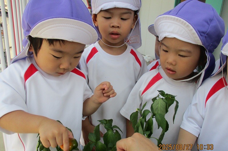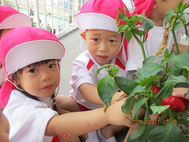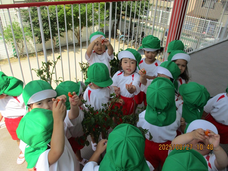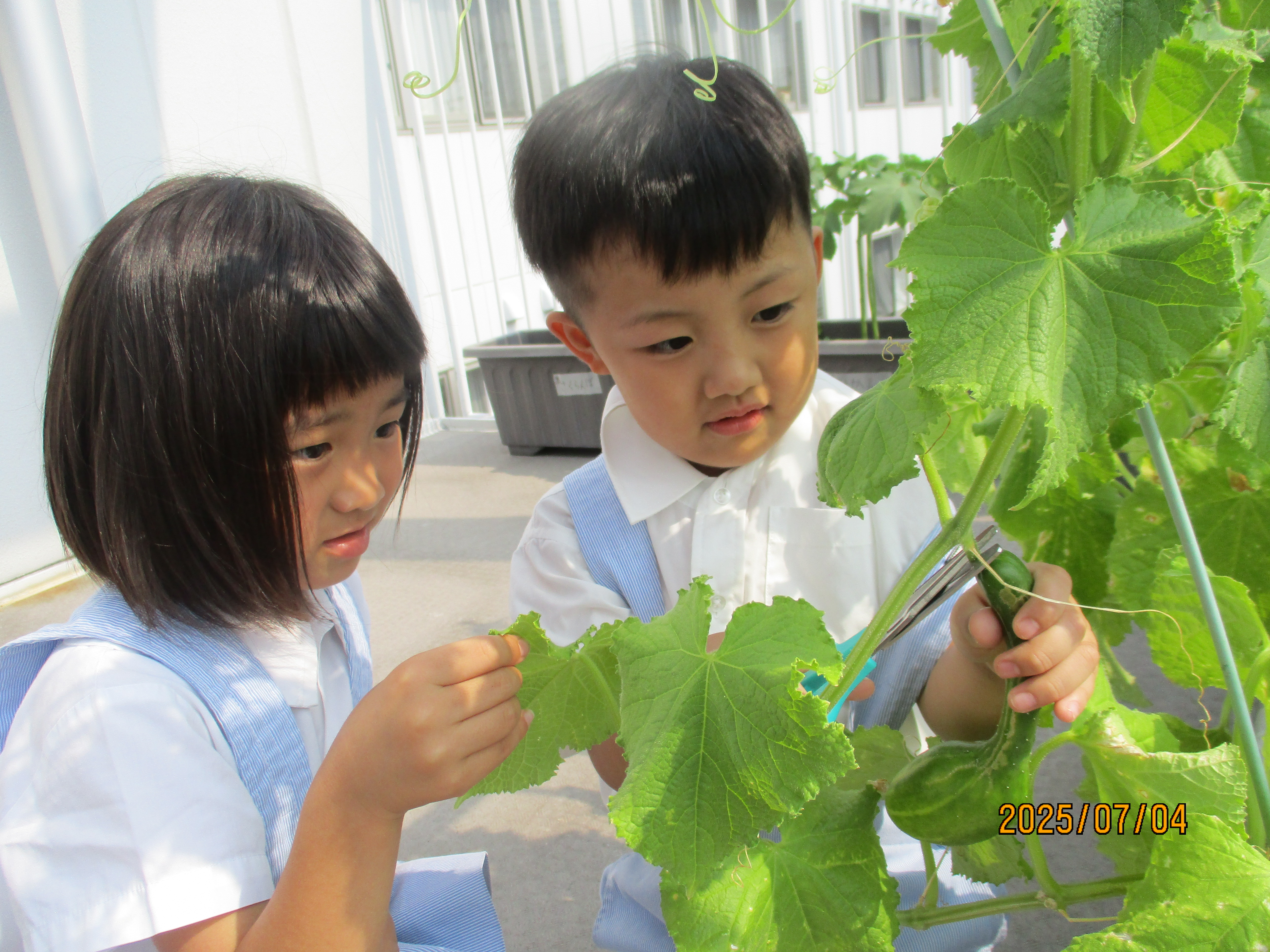 5月に2歳児はパプリカ、3歳児はオクラ、4歳児キュウリの種をまき、「おおきくな~れ」と毎日水やりを交代でするなど大切に育てた野菜が実り、収穫と食べる喜びを味わうことが出来ました。自分たちで育てた野菜の味は格別だったようで「おいしい」と笑顔で食べていましたよ。
