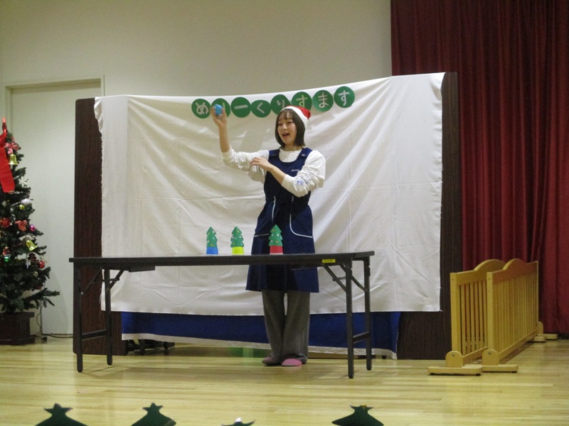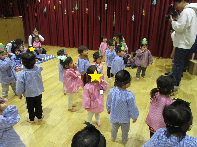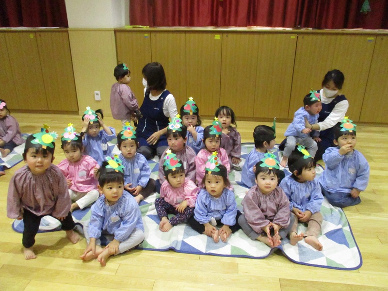 本日、あんず・もも組のクリスマス会が行われました。あんず組の子どもたちは、ツリーのお面をかぶり『おやつをたべよう』の曲に合わせて、かわいいダンスを披露してくれました。もも組の子どもたちも音楽や歌に合わせて体を揺らしたり、手をたたいたりして、楽しく参加していました。保育士の出し物の『クリスマスマジック』はみんな興味津々で不思議そうにしたり、驚いたりと様々な表情は見られました。明日は保育園にもサンタさんが来てくれるのでとても楽しみに待っています。
