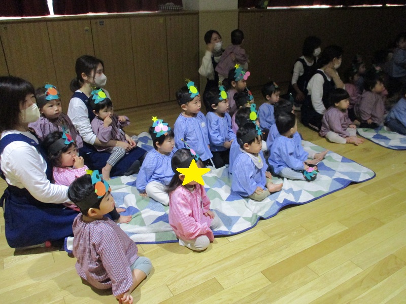 本日、東成区の図書ボランティア「絵本の会」の方が来てくださり、2,3歳児の子ども達に絵本の読み聞かせをしてくださいました。子ども達が喜びそうな内容のものばかりで、大型絵本や仕掛け絵本、パネルシアターなど盛り沢山のプログラムでした。子ども達も1つ1つ、興味を持って集中して見ていました。絵本が好きになるきっかけの1つになれば、嬉しいです。