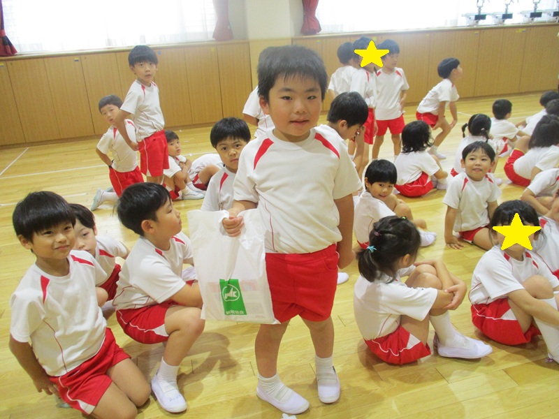 本日、幼児組の七夕まつりが行われました。年少から年長の縦割りのグループに分かれて、みんなで盆踊りを踊った後は、お楽しみのお遊び(ヨーヨー・人形すくい・玉入れ・わなげ・ボーリング)をしました。いっぱい遊んだ後は、おやつのジュースを飲んで休憩をしたり、プロジェクターで『たなばたさま』のお話も見ました。「たのしかった~」と大満足の子どもたちです。年長組のお兄ちゃんとお姉ちゃんは、年下の子のお世話も頑張っていましたよ。