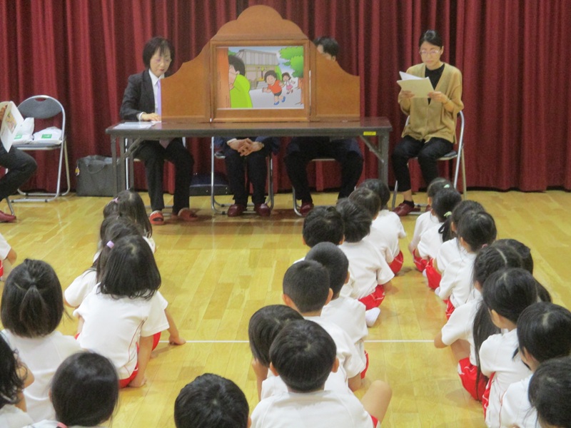 本日、東成絵本の会の3名の方が来て下さり、大型絵本や紙芝居、手遊びなどを披露して下さいました。子ども達は、集中して見たり、声や手遊びで一緒に参加したり、絵本の面白さにみんな大笑いしていました。いつも園庭遊びの際に見つけて遊んでいるダンゴムシの本は、食い入るように見ていました。とても楽しい時間を過ごせました。