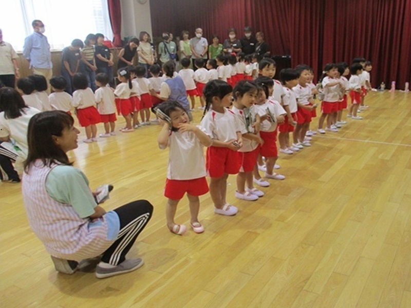 本日、東成消防署の方々に来ていただき、おもちゃ花火の指導をしていただきました。初めに、紙芝居で花火をする際のお約束を学びました。・花火は大人と一緒にする ・火は下に向け人に向けない ・洋服の袖をまくり腕をしっかり伸ばす ・バケツに水を入れて用意しておく ・ごみなど燃えるものの近くでしない 話をしっかりと聞いた後は、園庭に出て実際におもちゃ花火を指導していただきました。約束事をしっかり守れており「上手だね~」と褒められ「もう一回やりたい‼」と花火を楽しんでいました。最後はミニ消防車を見せていただき、楽しいひと時を過ごしました。