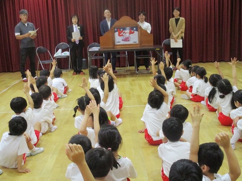 本日、年長組の子ども達が税教室に参加しました。最初に宇宙から来たタックスくんの紙芝居を見ました。その後に紙芝居の内容のクイズがあり、元気に手を挙げて答えており「紙芝居をよく見てくれていましたね」と褒められました。お土産に折り紙を頂き「やったー!」と喜んでいた子ども達でした。