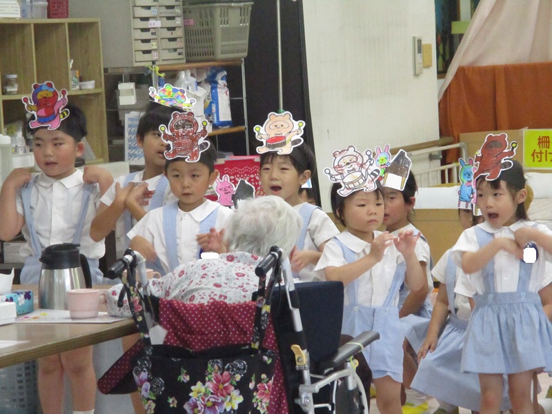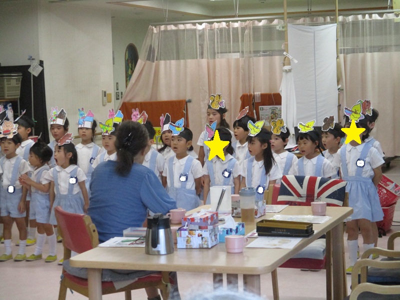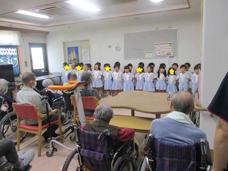 本日、年長組の子どもたちが、老人ホーム(サンローズオオサカ)を訪問しました。りんご組は手遊びと『東京ブギウギ』『見上げてごらん夜の星を』の歌をうたいました。ぶどう組は『幸せなら手をたたこう』『さんぽ』『山の音楽家』を歌って踊りました。おじいちゃん、おばあちゃんはとても喜んで下さり、一緒に歌ったり、振りや手拍子で参加されていました。子どもたちも「かわいいね」「上手やったよ」と拍手をもらい嬉しそうでした。