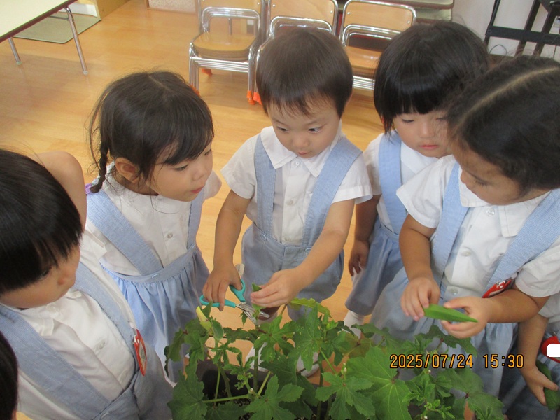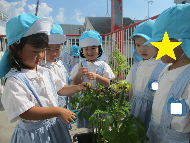 5月に2歳児はパプリカ、3歳児はオクラ、4歳児キュウリの種をまき、「おおきくな~れ」と毎日水やりを交代でするなど大切に育てた野菜が実り、収穫と食べる喜びを味わうことが出来ました。自分たちで育てた野菜の味は格別だったようで「おいしい」と笑顔で食べていましたよ。